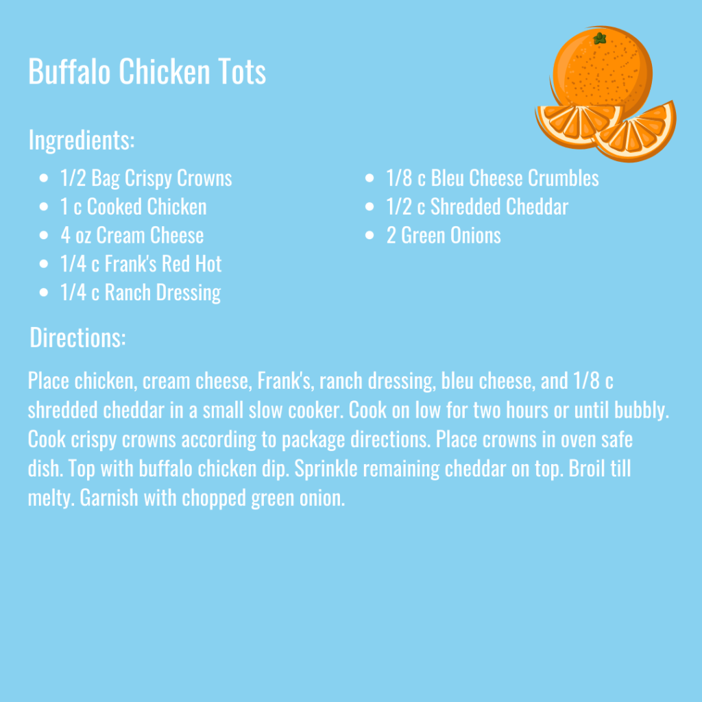 Buffalo Chicken Tots (Crispy Crowns topped with Buffalo Chicken Dip and Melted Cheddar Cheese)