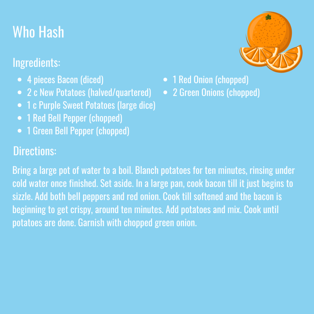 Who Hash (Bacon, New Potatoes, Purple Sweet Potatoes, Green and Red Bell Peppers, and Red Onion)